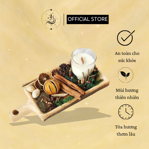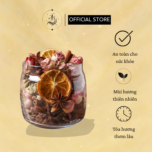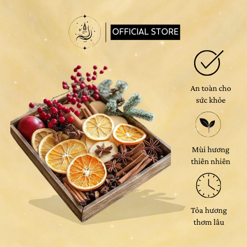 – Cam sấy khô (Dried Orange Slices): thơm nhẹ, tạo điểm nhấn thị giác và mùi hương tươi mát.
